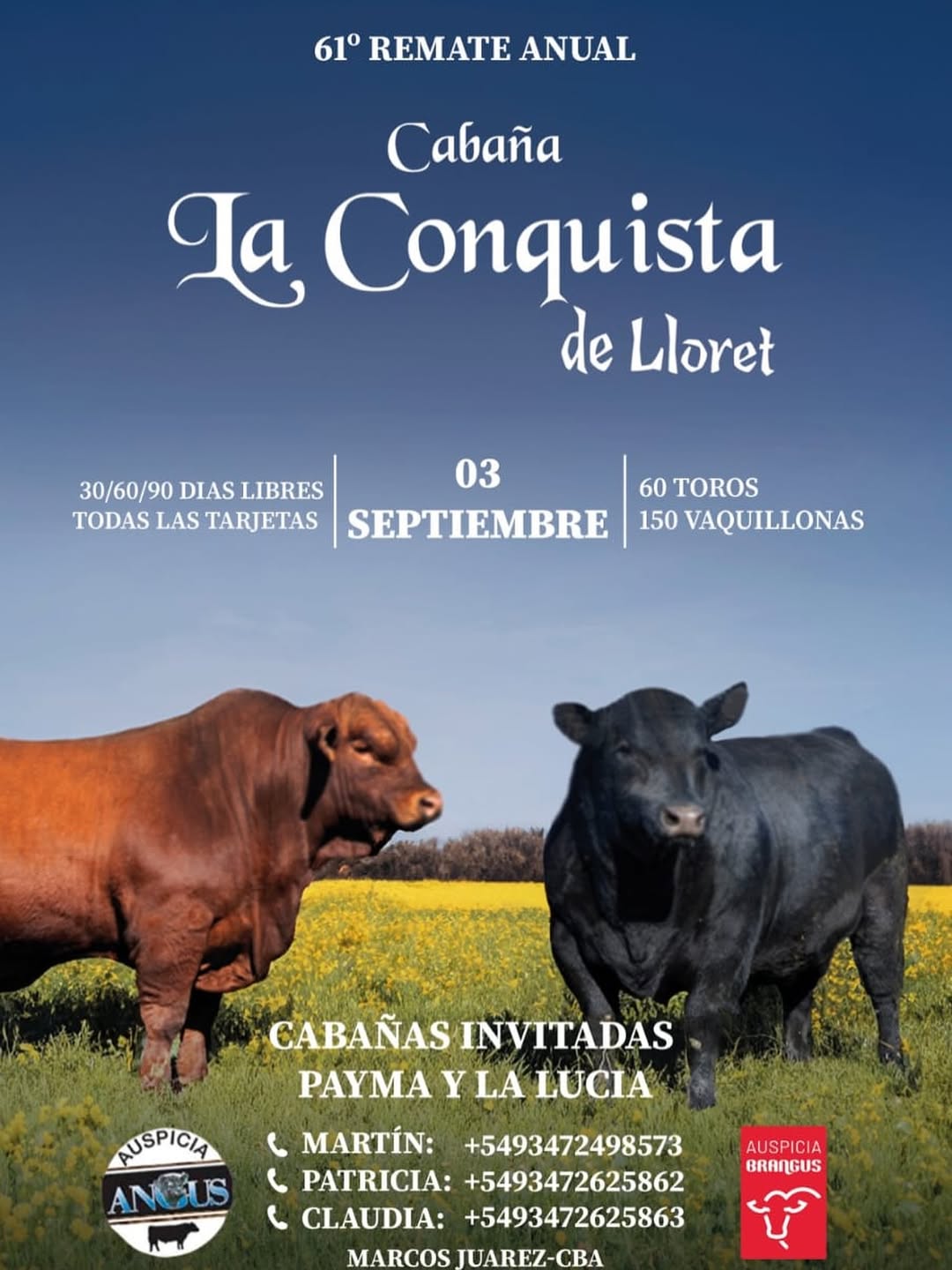 El próximo miércoles 3 de septiembre, Cabaña La Conquista realizará su 61° Remate Anual, un evento que ya es tradición en el calendario ganadero argentino. La cita será en la cabaña, ubicada sobre Ruta Provincial N°12, km 37,5 en Marcos Juárez (Córdoba), con modalidad presencial y por streaming en www.elrural.com.
