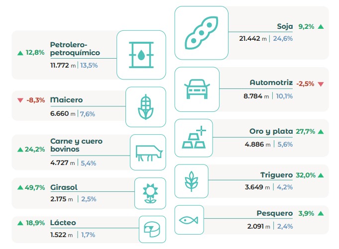 Este informe destaca que siete de los diez principales complejos exportadores del país provienen del campo y la agroindustria, consolidando al sector como el principal motor económico.