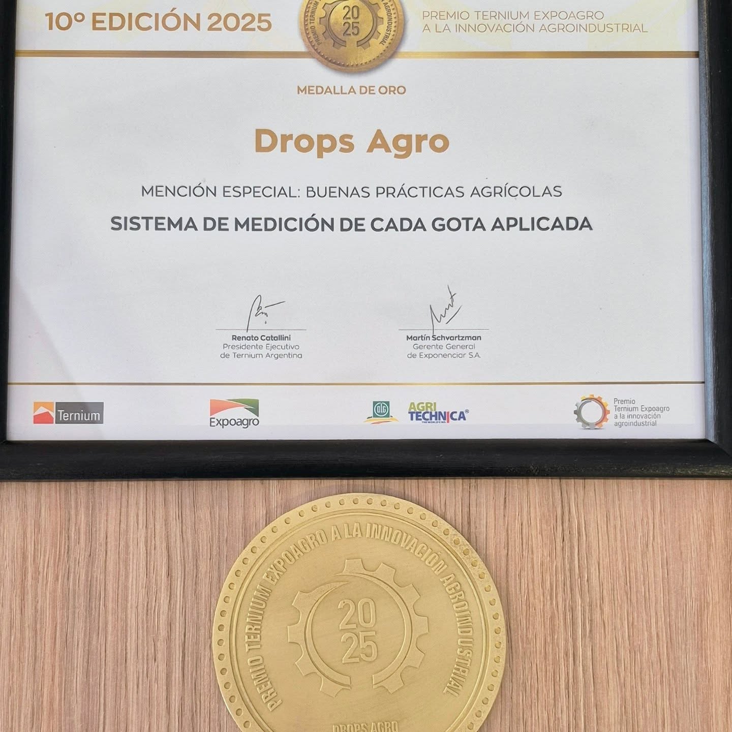 La empresa Drops Agro fue distinguida con la medalla de oro y mención especial en buenas prácticas agrícolas en los premios Ternium durante Expoagro, gracias a un innovador sistema que permite medir cada gota aplicada en pulverización en tiempo real.